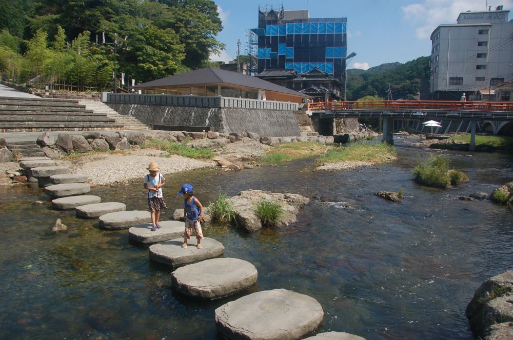 長門湯本温泉の音信川沿いでは東屋や川床テラス、足湯などが設置され川沿いを散策をのんびり散策できます。浅瀬でちょっとした川遊びができる場所も!(民泊母屋から車で40分)