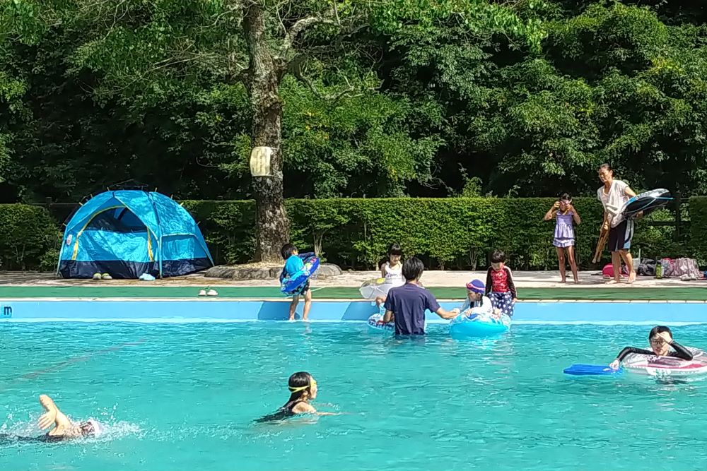川の水だからとても冷たくて、猛暑の日でも涼やかに過ごせます。プールサイドの河川敷では本当の川遊びもできますよ。幼児向けのキッズプールも。(民泊母屋から車で30分)