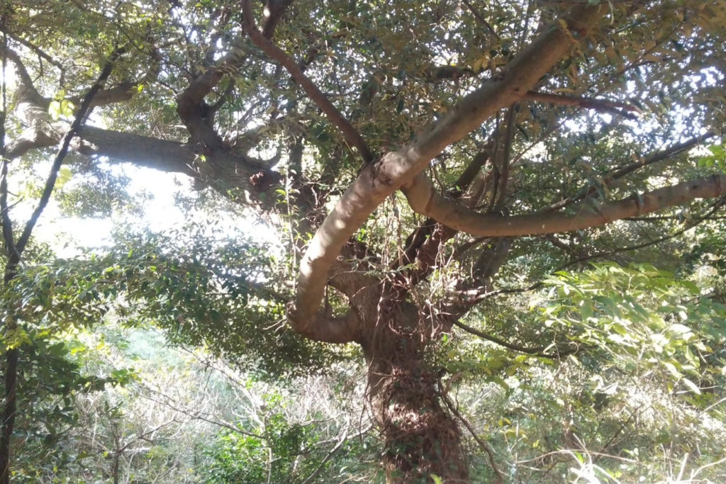 裏山は落ち葉がふかふかの照葉樹林で、薪や焚付けを得たり、子どもの遊び場になったり…向津具半島らしいシイやカシなどの照葉樹の森で、昔から里山として生活に直結していた裏山。