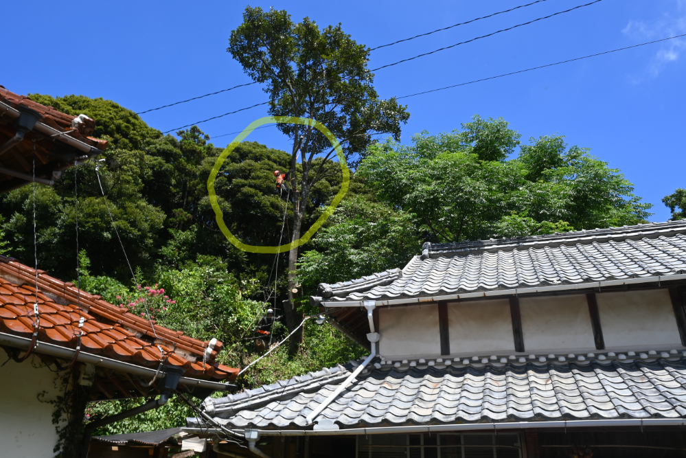 屋根だけでなく電線にかかる枝もあり、根元から倒せるような位置に立っていないため、ツリークライミングで少しずつ伐採する「特殊伐採」が必要とのことでした。